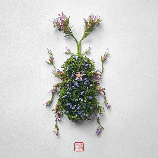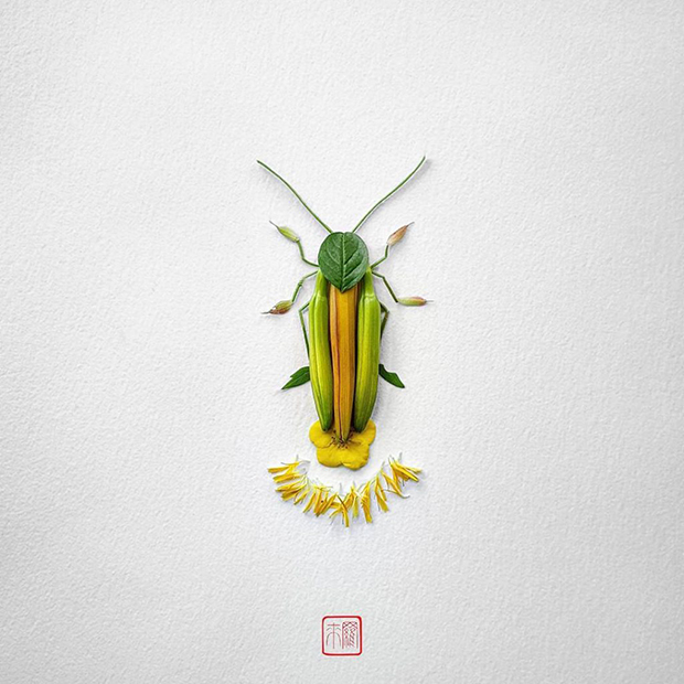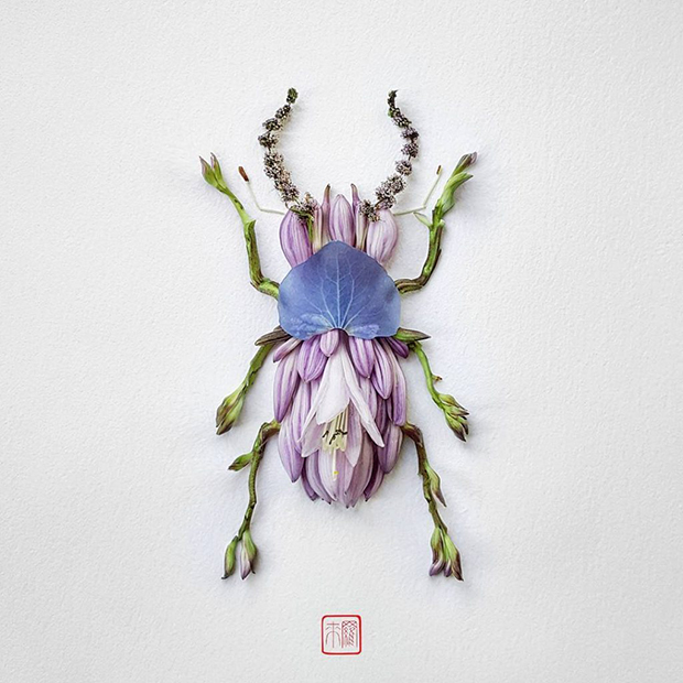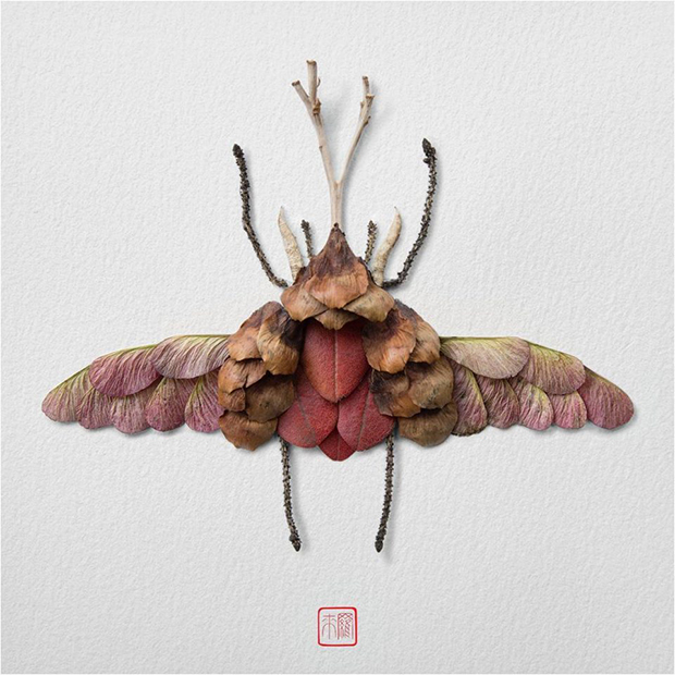 Esse trabalho começou no ano passado, quando Inoue começou a postar fotos das suas criações no Instagram. A série, intitulada Nature Insects (Insetos da Natureza) imediatamente fez sucesso, atraindo os olhares de pessoas do mundo inteiro. O artista usa uma variedade de folhas e pétalas para criar figuras de insetos como besouros e borboletas.