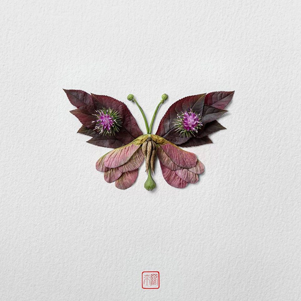 Depois dessa primeira leva, ele continuou a criar outros arranjos, variando na escolha do material ou dos tons usados. Ao criar outras borboletas e moscas, por exemplo, o artista usou apenas folhas sazonais e escolheu as pétalas em tons pastel, com as quais combinou algumas folhagens verdes e em alguns casos, cascas marrons que dão um tom especial para imitar aspectos físicos de alguns insetos.
